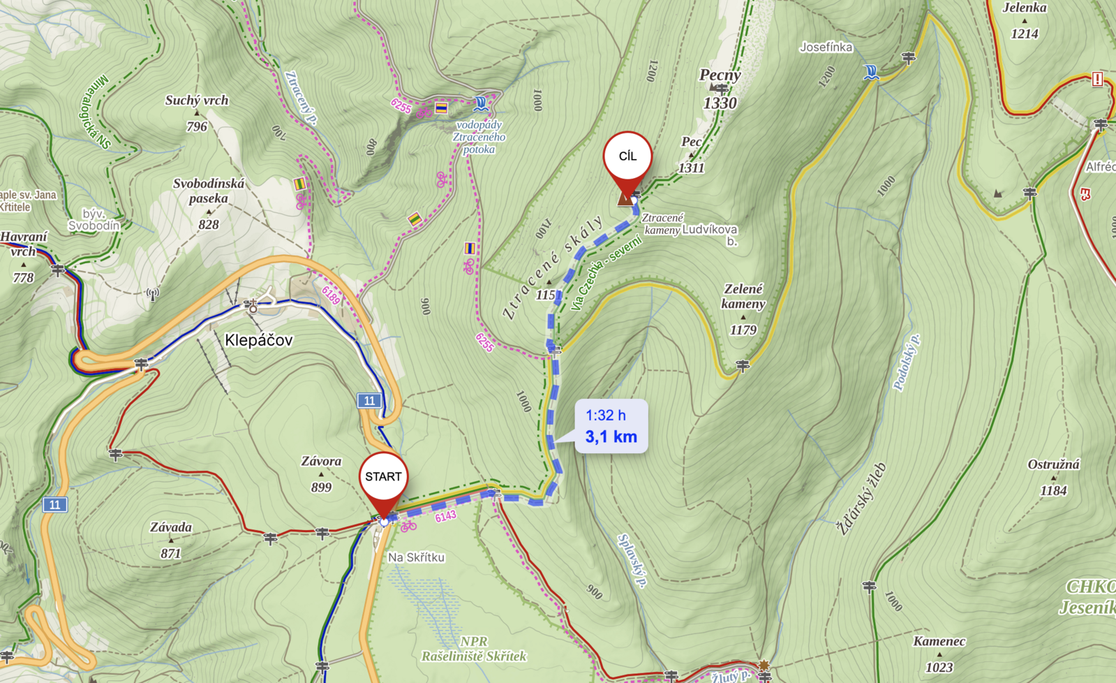 Náročnější, velmi oblíbená trasa vede ze Skřítku po zelené značce směr Ztracené kameny – Pecný – Jelení studánka - bývalá turistická chata Alfrédka (žlutá souběžně s červenou) – Pod Josefínkou (žlutá) – Pod zelenými kameny – Pod Ztracenými kameny – Nad Skřítkem – Skřítek. Délka této trasy je 16,6km, časová náročnost kolem 6-ti hodin.